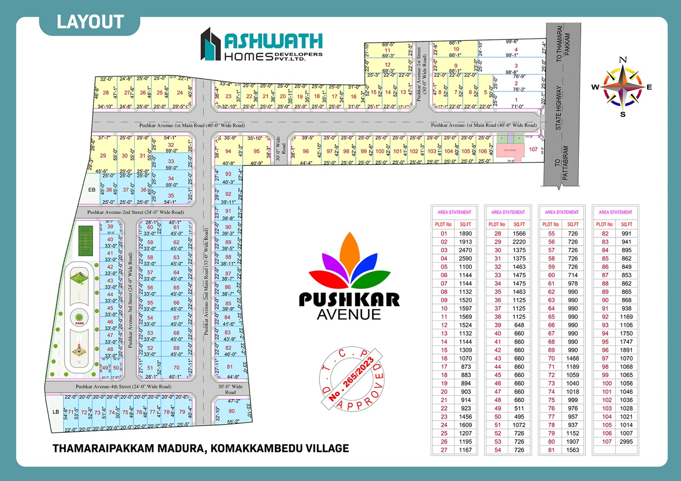 This project has been developed by Ashwath Homes, a leading property developer in Chennai. It is a 4.65 Acre Lavished Community and on road property in Thirunindravur. It has access to Ambattur, Avadi and Pattabiram with frequent bus services. It is a fully compounded property surrounded by houses and no pollution. It has immediate vicinity to schools and colleges. Other Amenities includes Children Play Area, Well Black Top Road and Street Lights. 90% Bank Loan Facility available. Overall it is a good location for investment and immediate construction.